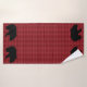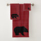 Red plaid cabin style design on towels. Add your family name to personalize.