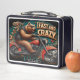 A bear clad in a leather vest rides a vibrant motorcycle, showcasing its adventurous spirit. The colourful lunch box captures a sense of wild fun and camaraderie.