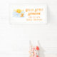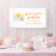 A cheerful watercolor banner design featuring a smiling sun rising above soft blue clouds, surrounded by glowing stars and a cuddly teddy bear. The warm yellow and sky-blue palette creates a joyful and welcoming atmosphere inspired by the popular sunshine theme. Personalized with a name, this charming layout is perfect for decorating baby celebrations, photo backdrops, and creating a memorable focal point for special moments.