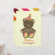 A birthday party invitation featuring an illustration of a brown stuffed bear with striped paws and ears wearing a matching party hat. Personalise the text on front and back. Back is striped at top.