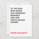 Celebrate your amazing boss with a touch of humour this holiday season! Our "To the boss who makes our workdays bearable and our coffee breaks longer: Happy Holidays!" card is the perfect blend of gratitude and laughter. Express appreciation for a boss who brings joy to the office, making both work and coffee breaks a delight. Elevate your holiday wishes with a dash of humour for a festive and memorable greeting!