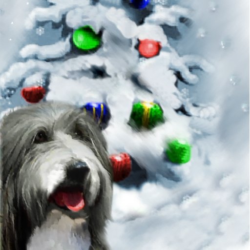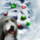Stunning Bearded Collie holiday art design looks great on a wide range of xmas gift ideas. Christmas cards, ornaments, apparel, and more.