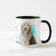 A portrait of an adorable Bearded Collie Dog is the feature on two sides of this mug. Each image is placed on a bright blue spatter background. Between the two images is the text that describes this gentle and loyal companion, with "the BEARDED COLLIE dog" in black at the bottom. All the text is easily customised to anything you'd like so that you may describe your own loyal friend.