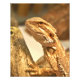 Bearded dragons, affectionately known as 'beardies', are reptiles that are commonly kept as pets. Their scales make them look quite rough, spiky, and prickly, but they are actually not that pointy and in fact feel quite nice to the touch. This young bearded dragon posed for a nice portrait while resting on a branch in his terrarium. His picture would make a great gift for anyone who keeps reptiles or those who prefer to admire them from a bit father away!