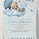 Teddy Bear we can bearly wait Baby Shower All in One Invitation with tear away Diaper Raffle card. Adorable brown teddy bear asleep on fluffy clouds next to a crescent moon and stars.