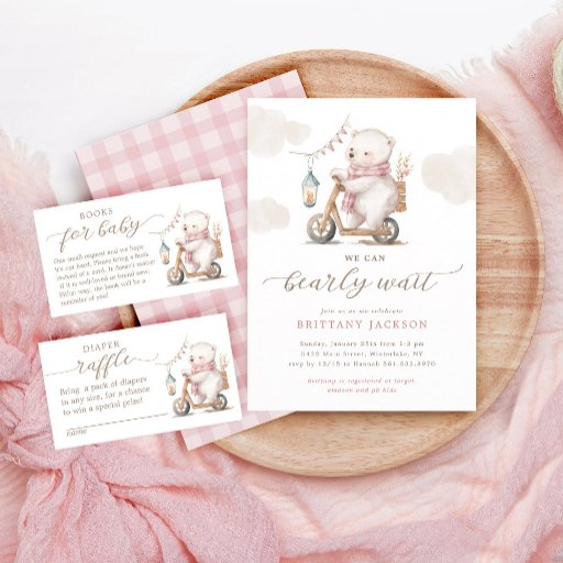 Bearly wait girl baby shower enclosure card features a watercolor of a white teddy bear riding a scooter with a elegant script type treatment with the saying "we can bearly wait". Easily customise this template with your event details. An adorable spring or summer enclosure card — perfect for your event! This cute teddy bear design belongs to the "Bearly Wait Scooter Girl" baby shower collection.