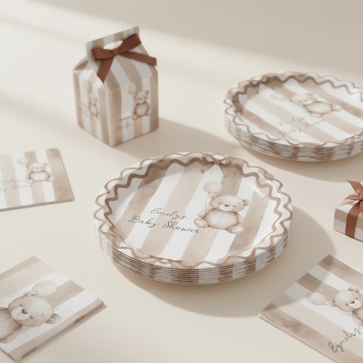 This Bearly Wait paper plate design features a soft teddy bear illustration paired with warm beige and brown vertical stripes, finished with an elegant scalloped border and bow accents. The neutral color palette and classic style create a cozy woodland-inspired look, perfect for refined baby shower table settings. Designed to coordinate seamlessly with the complete Bearly Wait baby shower collection for a cohesive and timeless celebration aesthetic.
