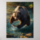 A majestic bear is skilfully catching a fish in a serene river setting. The bears powerful movement and intense focus are captured in this dynamic painting.