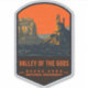 A vintage travel badge design of mesas, buttes and towers in Valley of the Gods, formerly part of Bears Ears National Monument located north of Monument Valley near Bluff, Utah.