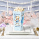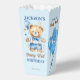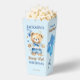 Beary first boys birthday party tableware personalised popcorn favour box, watercolor cute teddy bear dressed up in pant and a bow tie holding a blue balloon party favours blue brown and white colour theme teddy bear popcorn favour box.
