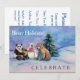 A panda bear, a polar bear, and a brown bear sit holding Christmas holiday gifts on a snow covered field with an evergreen tree in the background. Holiday invitation card message reads "Beary Holidays" and "CELEBRATE". The back of the invitation card has the holiday open house party details. Customise this card with all your own personalised options!