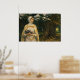 Behind her, dense greenery and pale blossoms form a textured curtain of leaves, while a massive tree trunk anchors the scene with warm browns and golds. Light filters through the branches to the right, opening into a glowing path that suggests distance and possibility. Waterhouse’s painterly brushwork and gentle contrasts make the atmosphere feel hushed and timeless, blending romance, nature, and introspection into a single, unforgettable image.