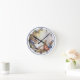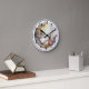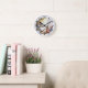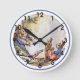Personalise this round wall clock printed with a cute Beatrix Potter illustration art image of a rabbit family. Created in soft peach orange, blues and browns with a blue circle border accent. Nice nursery or toddler room accent, coordinates with lamps, pillows and other nursery decor items at www.zazzle.com/kidsunique