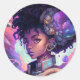 A beautiful dark skinned girl with a curly afro and an ornate headdress.
