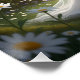 A beautiful fairy wearing a flowing white dress and a necklace made of diamonds with daisies and diamonds in her long silvery-white hair and iridescent white dragonfly-like wings holding a daisy stands in a magical forest surrounded by daisies and moss covered trees.