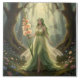 A beautiful fairy wearing a flowing light green dress and jewellery made of peridots with peridot stones in her long light green hair and translucent dragonfly-like wings holding a gladiolus walks in a magical forest surrounded by pink and blue flowers and vine-covered trees.