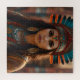 A woman with piercing dark eyes stares directly at the viewer, her face framed by a magnificent headdress of turquoise and orange feathers. She is adorned with intricate jewellery: a beaded headband with a central turquoise stone, large feather earrings, and layers of necklaces made of beads, feathers, and metalwork. Her expression is serious, her gaze unwavering, conveying a sense of strength and wisdom. The background is blurred, suggesting a natural setting and emphasizing the woman as the focal point.