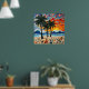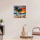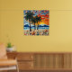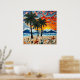 An impasto oil painting style ai illustration of a beach full of palm trees, sea glass, sea shells and ocean waves at sunset. A bright colourful mesh of colours make this coastal art vibrant and beautiful!