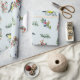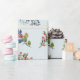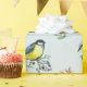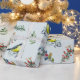 This pretty watercolor wrapping paper will be a favourite of anyone who studies birds or just enjoys feeding them and watching them out their windows. There are two types of birds here; one with a yellow belly, black wing feathers and a black cap on its head. The other is a grey and white bird. There are ferns, pine boughs and red berries all around that the birds are happily having an afternoon feast on. The background is a pale blue. Available in 3 different sizes.