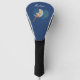 This custom golf club cover for your drivers is dark blue with a beautiful fantasy fairy with big blonde hair wearing silk stockings sitting on a white moon. Customise your name with the template.