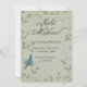 Beautiful painting of a blue warbler bird flying upwards placed on a soft ash green mottled background with elegant leafy vines. Stand out from the crowd with this beautiful and elegant unique wedding save the date card. The design is given a faux fabric texture for effect. This wedding save the date card design also comes on many other stationery products to suit all your wedding set needs.