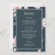 Beautiful moody floral pattern classic wedding menu features a delicate botanical pattern of blush pink flowers and a dark blue background.