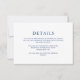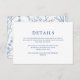 Beautiful blue and white wedding guest detail card features romantic illustrated flowers and classic typography. The back is a beautiful line art floral pattern.