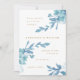 Simple and elegant blue floral wedding invitation with gold colour text on a white background and a solid blue back of the card. Chic watercolor flowers combine in a mix of dark and light blue botanical arrangements.