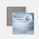 A baby shower or birthday thank you magnet with a magical fantasy sky with fluffy blue clouds and a big beautiful moon. 2 white swans flying off together.