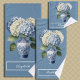 beautiful bouquet of hydrangea flowers arranged in a vase on blue background. The hydrangeas are in shades of light blue and creamy white, with delicate petals that create a full, rounded shape. The vase is a classic white and blue design, likely inspired by traditional porcelain or ceramic styles, with intricate patterns and floral motifs that complement the flowers. The entire scene has a soft, watercolor-like quality, giving it a gentle and elegant appearance. The green leaves of the hydrangea add a natural touch, enhancing the overall composition.