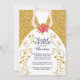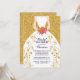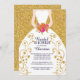 Modern bride bridal shower invitation featuring a bride in a white gown with a faux gold floral swirl accent and a hot pink & orange and gold bridal flower bouquet set on a classy classic gold faux glitter background. Flip our chic & stylish bride wedding shower invitation over to view a matching glitter back for an extra special touch. Contemporary bridal shower invite for a spring bridal shower, summer bridal shower, fall bridal shower or winter bridal shower. Visit our shop to view this popular bride design in a variety of colours.
