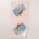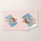 Towels with a pretty brown deer with a white spotted back. A little bird sitting on the deer's back. A fancy floral bouquet with watercolor roses and light olive green leaves under the deer's feet. A blue watercolor rectangle behind the image. Innocent and sweet design with rustic elegance. Peach coloured background.