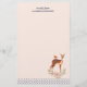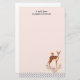 Stationery paper with a beautiful brown doe with white spots on her fur. A cute bird sitting on the deer's back. An elegant flower arrangement composed of watercolor roses and light green leaves beneath her feet. A blue polka dot border with a peach coloured background. Darling and adorable design. Personalise with a name.