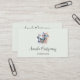 Business cards with a trio of butterflies fluttering among some pretty flowers. Blue pink and green colour scheme.