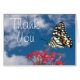A close up photo of a colourful butterfly feeding on a flower against a blue sky background.