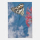 A close up photo of a colourful butterfly feeding on a flower against a blue sky background.