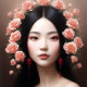 Beautiful Chinese woman with roses in her black hair, delicate and romantic, aiart. Portrait of a beautiful Chinese woman, with roses in her black hair, her delicate and fine face is highlighted by red hanging earrings, a crown of roses blooms her black hair ebony, delicacy, softness and romanticism reflect the character of this Asian beauty.