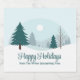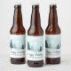 A beautiful winter landscape with teal green pine trees and snow covered ground on personalised holiday party beer bottle labels. Customise this company Happy Holidays gift for your corporate clients or employees.