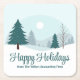 A beautiful winter landscape with teal green pine trees and snow covered ground on personalised holiday coasters. Customise this company Happy Holidays gift for your corporate clients or employees.