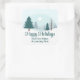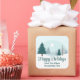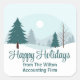 A beautiful winter landscape with teal green pine trees and snow covered ground on personalised business holiday stickers. Customise these company Happy Holidays stickers with your own corporate message.