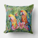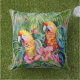 Pretty green, yellow and red colourful parrots in in tropical foliage and flowers throw pillow.