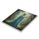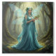 A beautiful fairy wearing a flowing turquoise-coloured dress and a necklace made of turquoise stones with turquoise and holly in her long turquoise hair and iridescent dragonfly-like wings holding a holly branch stands in a magical forest surrounded by grass, rocks and vine-covered trees.