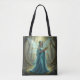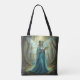 A beautiful fairy wearing a flowing turquoise-coloured dress and a necklace made of turquoise stones with turquoise and holly in her long turquoise hair and iridescent dragonfly-like wings holding a holly branch stands in a magical forest surrounded by grass, rocks and vine-covered trees.
