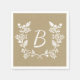 Rustic paper napkins with white floral wreath and custom monogram on distressed beige background.