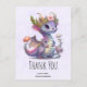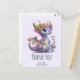Thank you postcard with an illustration of a mythical dragon. Purple and blue scales. A flowered gold crown with horns adorns its head. Magical, fun and friendly.