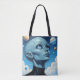 Ufology tote bag. A beautiful female alien extraterrestrial being with big blue eyes looking up into space at the stars and planets.