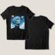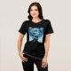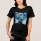 Ufology t-shirt. A beautiful female alien extraterrestrial being with big blue eyes looking up into space at the stars and planets.