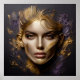 A portrait of a beautiful woman brought to life with a realistic effect. The image is embossed from textured black granite, and adorned with abstract golden lines, dark purple, and golden elements surround her face in an artistic embrace, creating a captivating and unique composition.