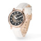 A watch with a beautiful illustration. A feminine face in the moon surrounded by flowers.