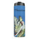 This thermal tumbler bottle to keep your drinks cold or hot has a beautiful fairy with red hair and monarch butterfly wings wearing a golden dress under a blue sky. Customise your name with the template.